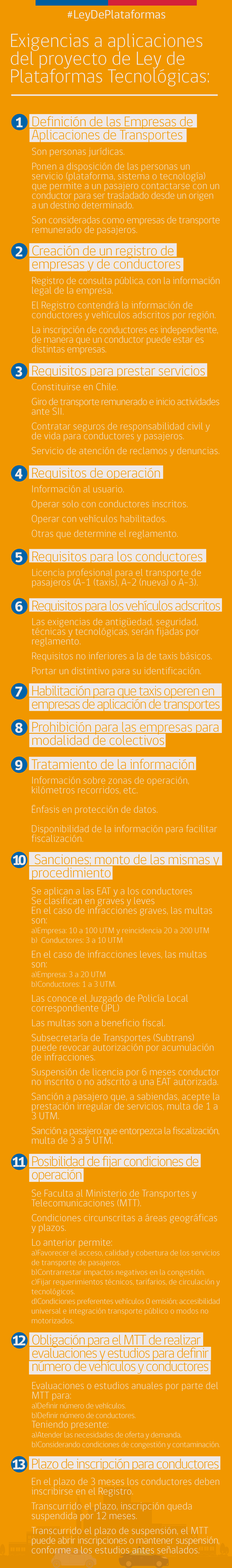 “Esta propuesta de ley establece una seria de exigencias a las aplicaciones, con el objetivo de generar condiciones de igualdad y una competencia justa. A modo de ejemplo, deberán definirse como empresas de transporte remunerado de personas, estar constituidas en Chile e inscritas en un registro público que contendrá la información de conductores y vehículos adscritos por región. Además, deberán contratar seguros de responsabilidad civil y de vida para conductores y pasajeros, y por obligación a los conductores se les exigirá licencia profesional para el transporte de pasajeros A-1, A-2 o A-3”, agregó la autoridad.