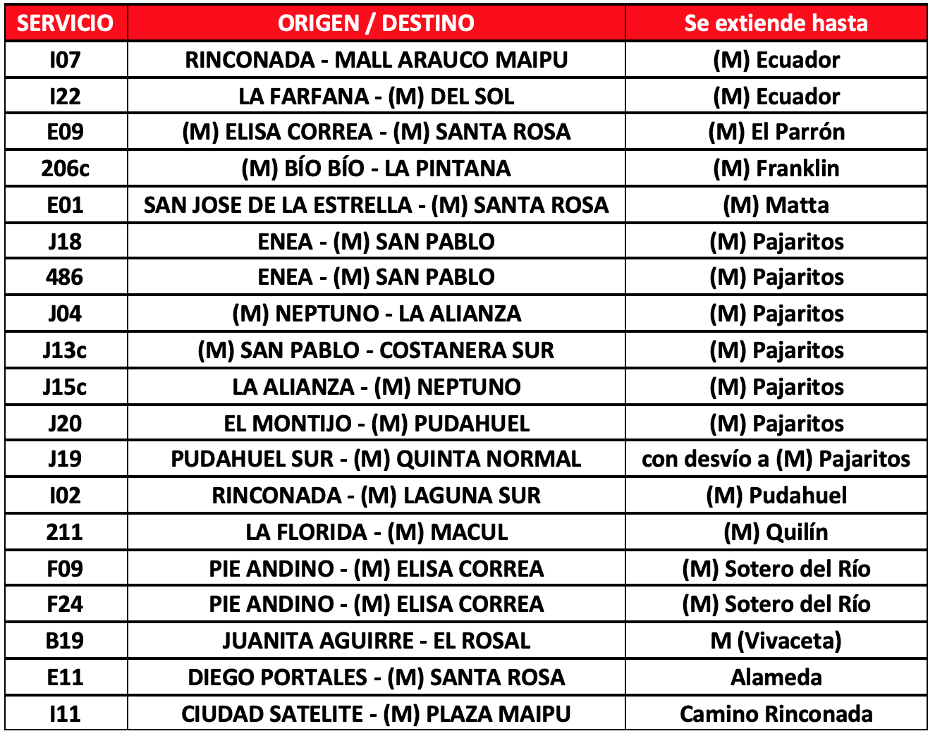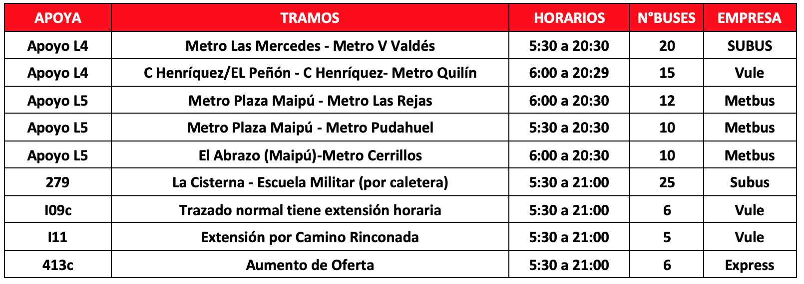 Respecto a los buses de apoyo, habrá 109 buses adicionales para reforzar la operación que se distribuirán en 9 servicios que permitirán a los usuarios de las comunas de Puente Alto, tener una alternativa de transporte en los tramos en que no está funcionado Metro. En caso de requerir más apoyos por aumento de aglomeraciones se activarán más servicios de buses.