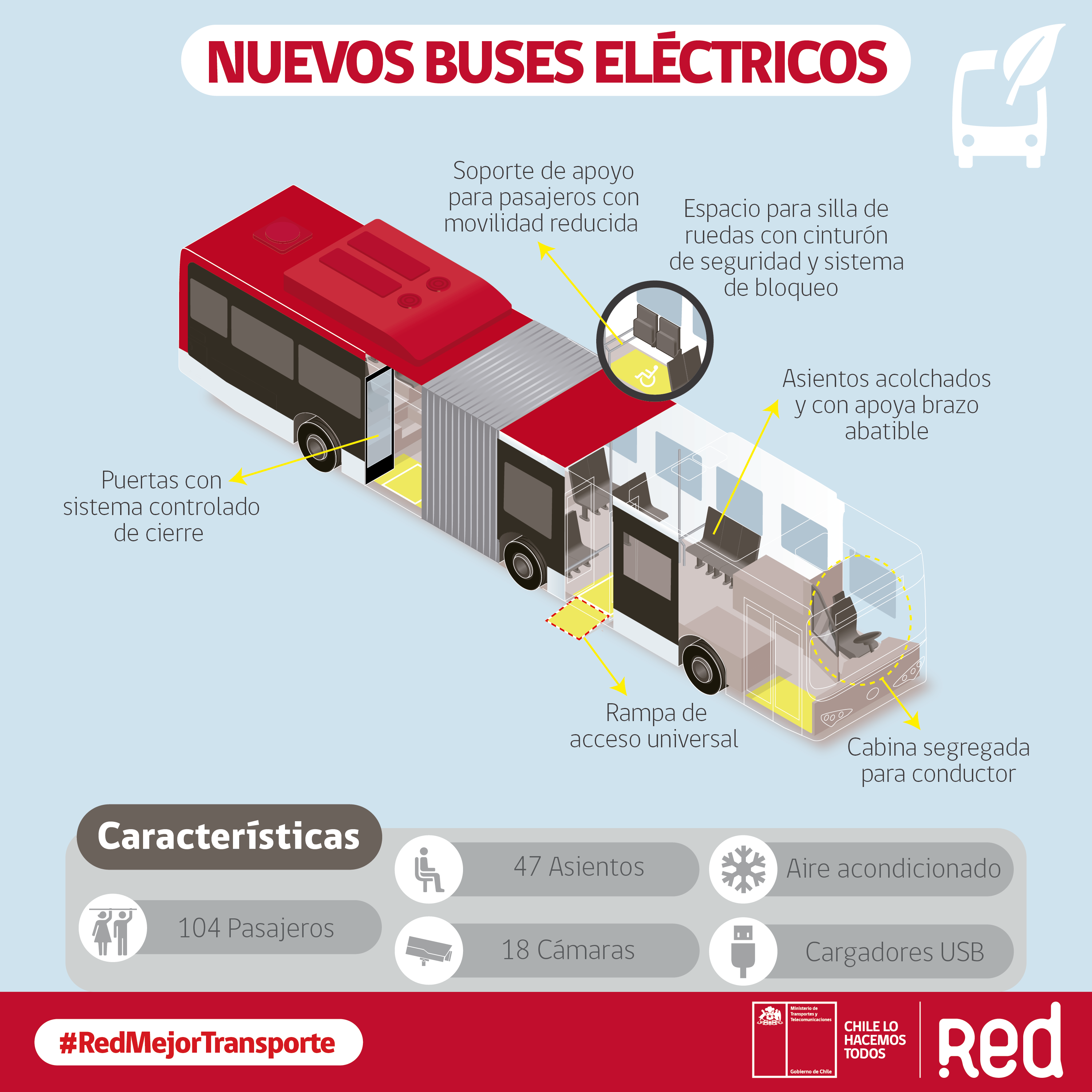 Al ser un bus 100% eléctrico circula sin emitir gases contaminantes ni ruidos y genera menos vibraciones durante el trayecto. Este vehículo, al igual que todos los buses nuevo estándar, posee asientos acolchados y una disposición interna más espaciosa y cómoda. Cuentan con aire acondicionado, conexión WIFI gratuito y puertos USB que permiten a los pasajeros cargar sus celulares.