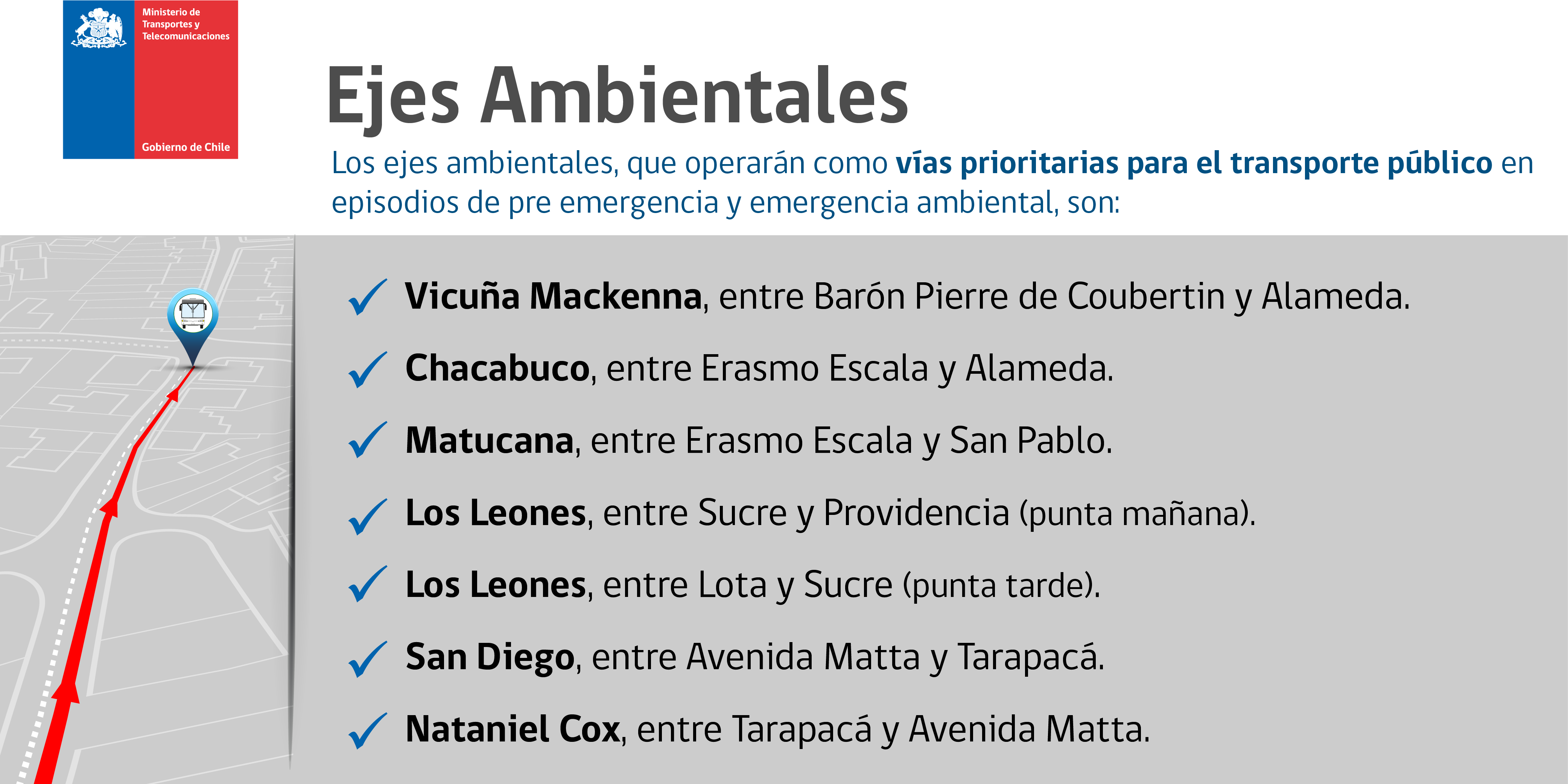 Con el objetivo de facilitar el desplazamiento del transporte público durante los días de preemergencia o emergencia ambiental, los Ministerios de Transportes y Telecomunicaciones y Medio Ambiente informaron sobre la futura implementación de los llamados Ejes Ambientales.
