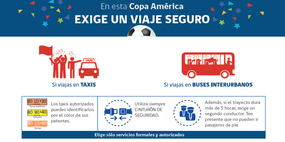 Dado que la Copa América generará un aumento de la demanda de viajes por tierra entre las distintas ciudades sede, el Programa de Fiscalización del Ministerio de Transportes y Telecomunicaciones contempla un reforzamiento de los operativos de control de buses interurbanos, minibuses y taxis, además del transporte informal en las cercanías de los terminales de buses y en los aeropuertos, con el objeto de garantizar un viaje seguro para las personas.