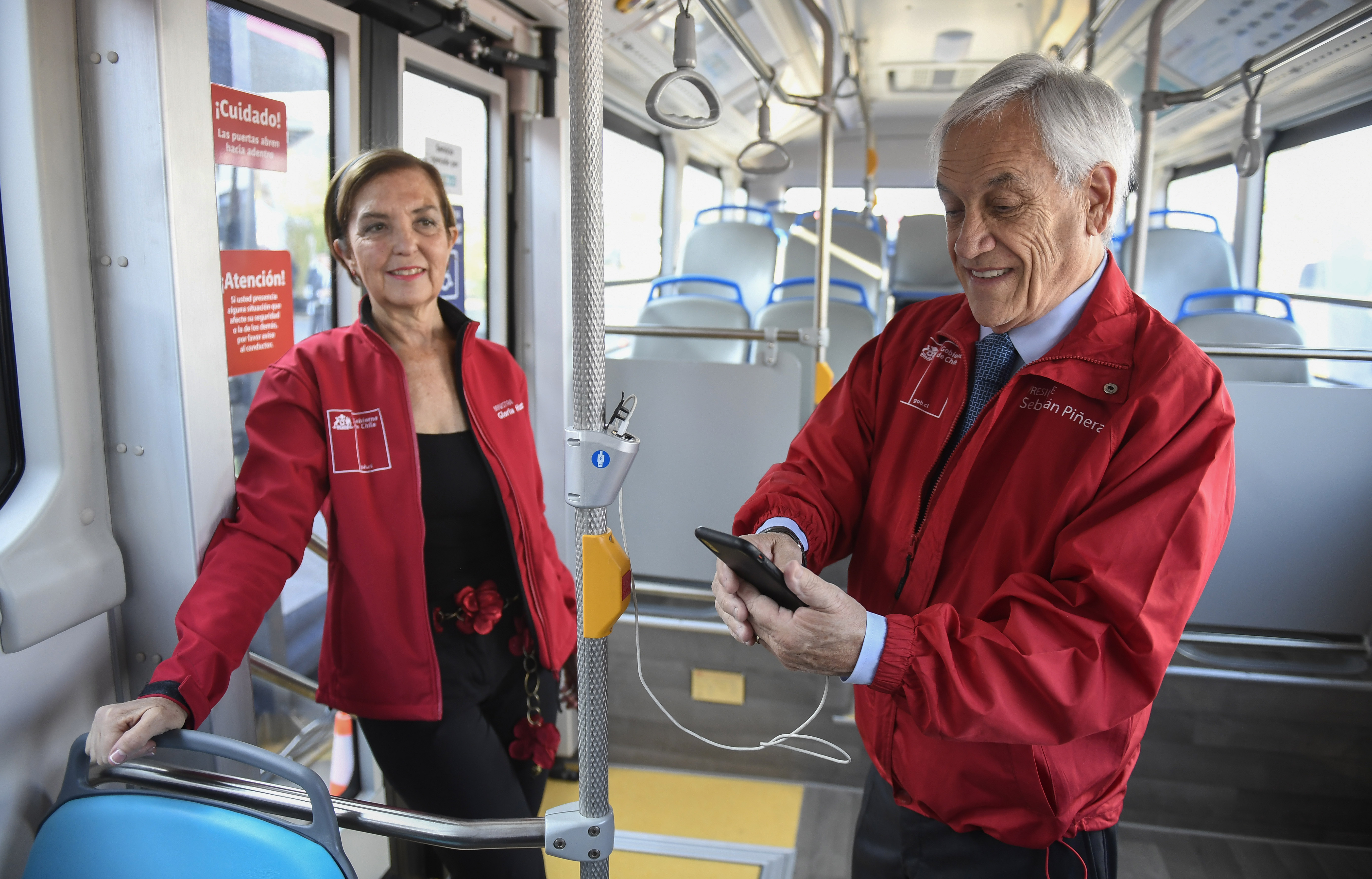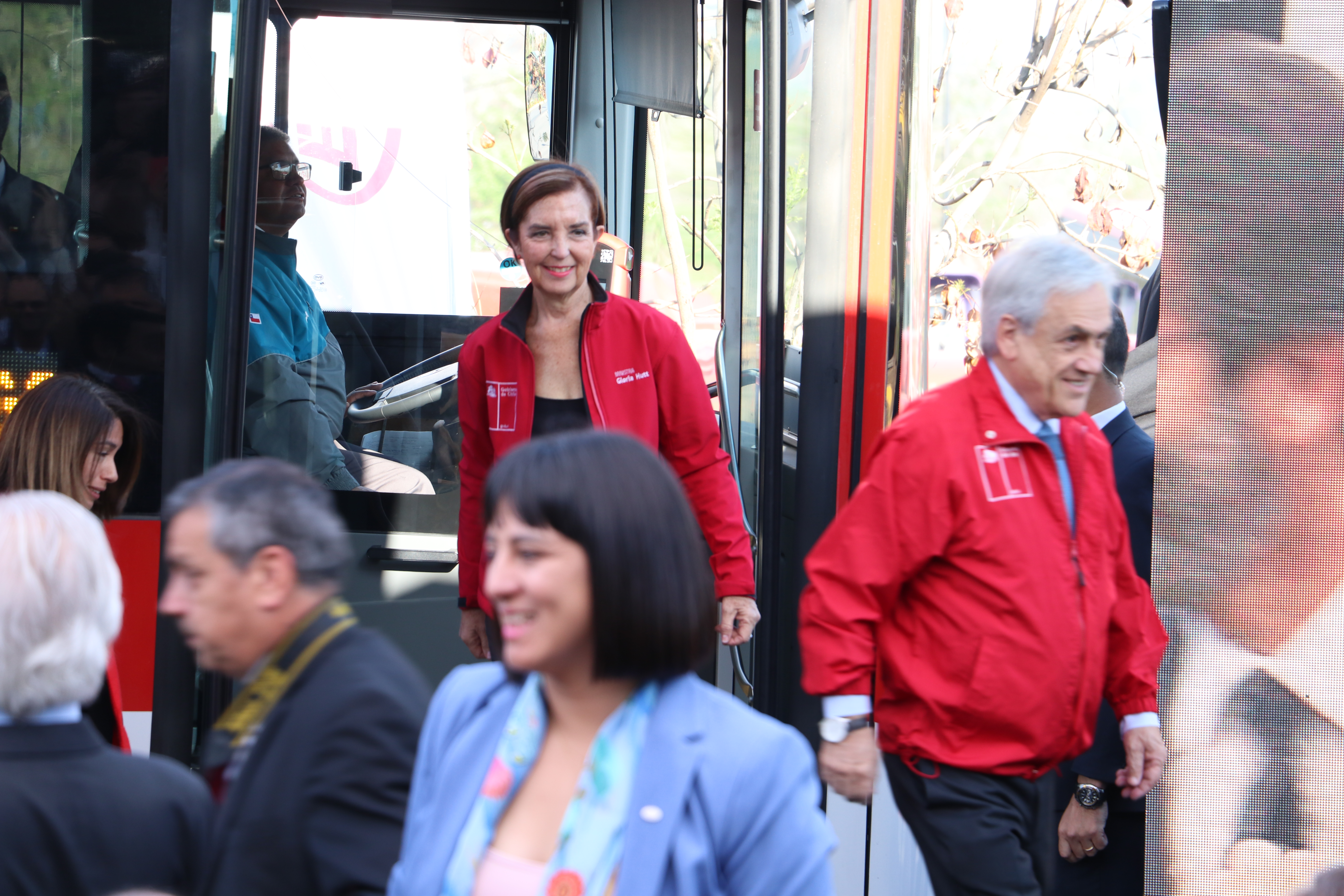 Nuevo buses eléctricos Presidente Piñera probando los puertos USBMinistra Gloria Hutt bajando del bus eléctrico