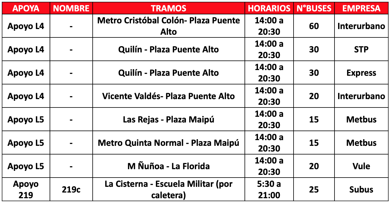 Asimismo, al igual que la semana pasada, se reforzarán los servicios con 215 buses Apoyo Metro, especialmente a quienes utilizan las Líneas 4 y 5. Serán en total 8 servicios que permitirán a los usuarios de las comunas de Puente Alto, La Florida, La Cisterna y Maipú tener mayores alternativas para llegar a las estaciones de Metro que están operando.