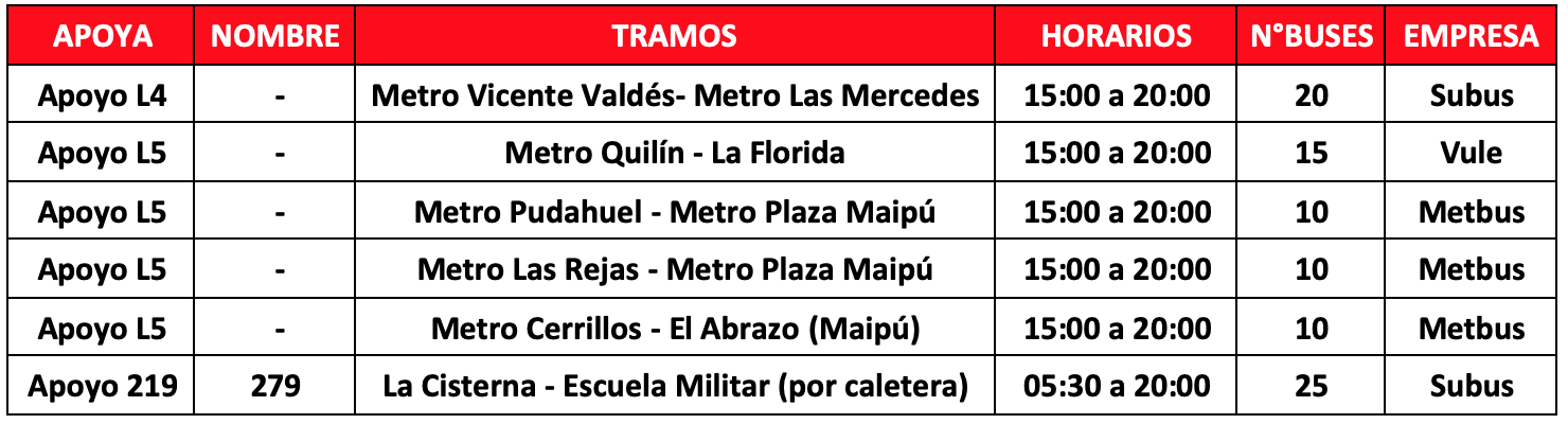 Debido a esto se mantiene para este lunes 02 de diciembre los 102 buses de apoyo a Metro, distribuido en 8 servicios, y las extensiones de recorridos para facilitar el traslado de los usuarios, principalmente en las comunas de Puente Alto, La Florida, La Cisterna y Maipú.