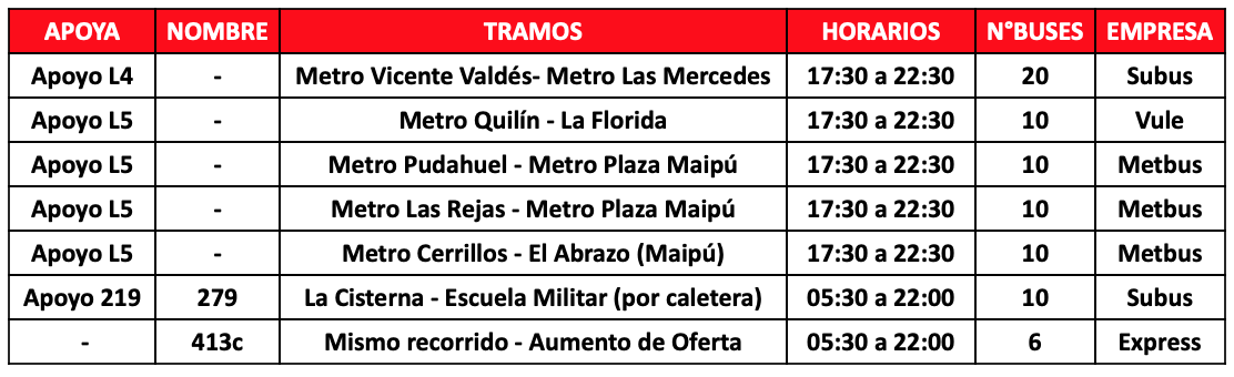 Aquí el detalle de los buses de apoyo, donde se indica a qué recorrido y/o línea de Metro apoyan y el tramo que recorrerá: