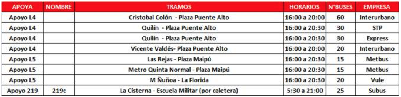 Asimismo, al igual que ayer, se reforzarán los servicios con 215 buses Apoyo Metro, especialmente a quienes utilizan las Líneas 4 y 5. Serán en total 8 servicios que permitirán a los usuarios de las comunas de Puente Alto, La Florida, La Cisterna y Maipú tener mayores alternativas para llegar a las estaciones de Metro que están operando.