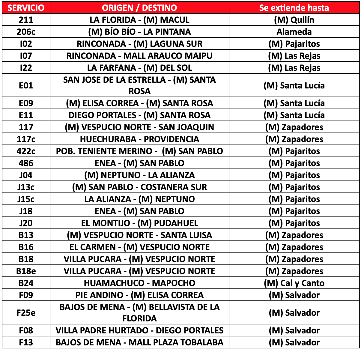 Aquí el detalle de los buses de apoyo, donde se indica a qué recorrido y/o línea de Metro apoyan y el tramo que recorrerá: