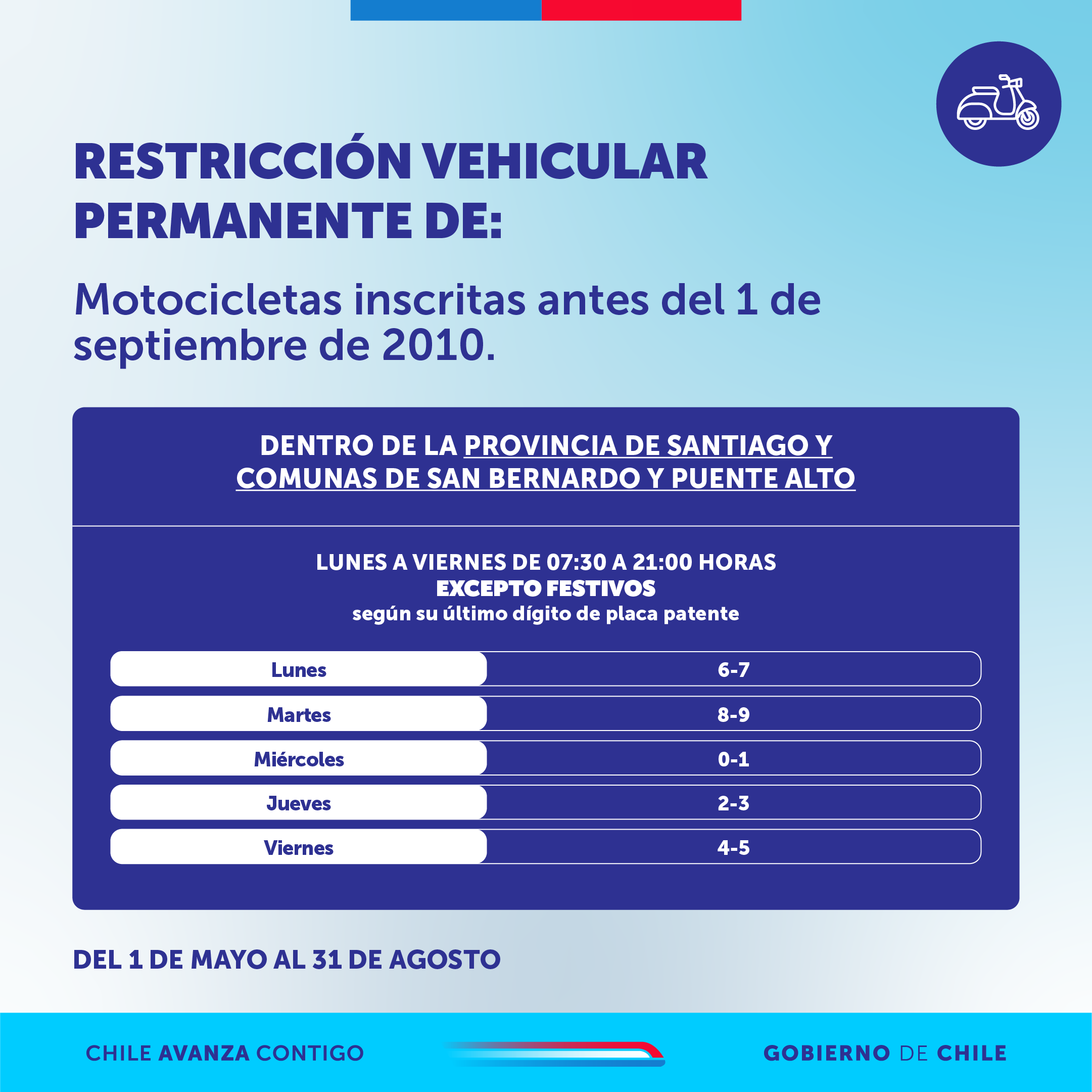 La medida establece que en el caso de los vehículos catalíticos con sello verde inscritos antes del 1 de septiembre de 2011, se aplicará restricción vehicular de dos dígitos diarios en la provincia de Santiago y en las comunas de Puente Alto y San Bernardo. Lo mismo para las motos inscritas antes de 2010.