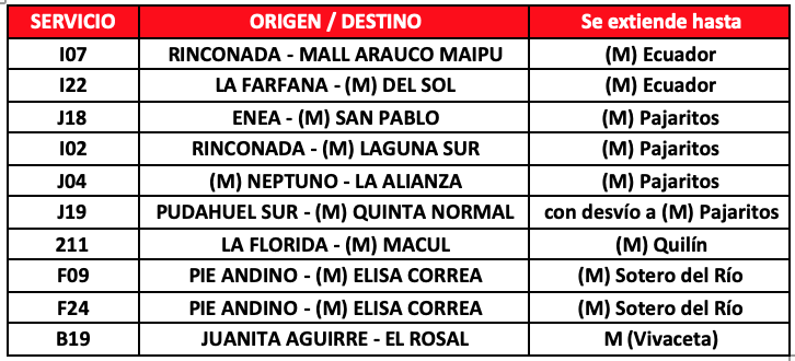 Adicionalmente, se contará con 27 buses, que se distribuirán en 3 servicios, y 10 extensiones de recorridos para cubrir aquellos tramos en que aún existen estaciones de Metro cerradas, que operarán hasta las 23:30.