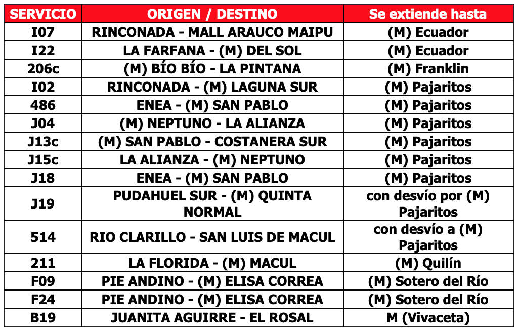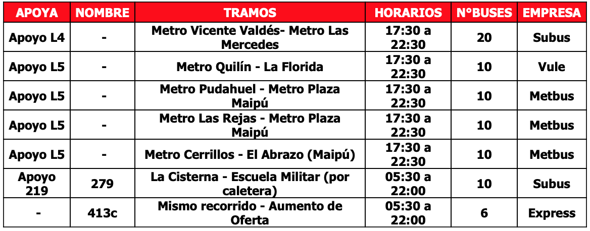Además, se mantienen los apoyos a Metro y las extensiones de los días anteriores. Serán 76 buses los que prestarán servicios de apoyo a Metro y que permitirán a los usuarios de las comunas de Puente Alto, La Florida, La Cisterna y Maipú tener mayores alternativas para llegar a las estaciones de Metro que están operando.
