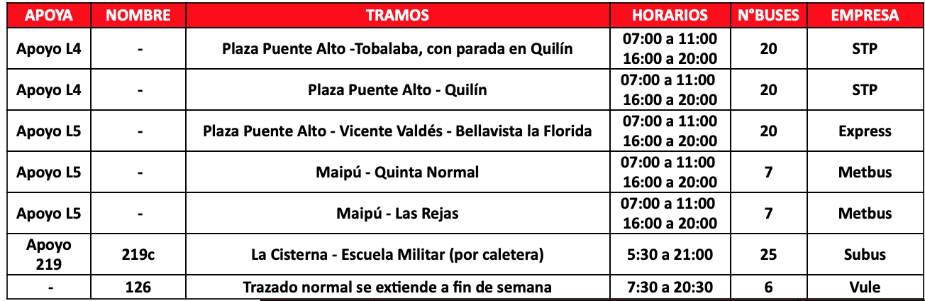 Respecto a los buses de apoyo, habrá 105 buses adicionales para reforzar la operación. Serán en total 7 servicios que permitirán a los usuarios de las comunas de Puente Alto, La Florida, La Cisterna y Maipú tener mayores alternativas para llegar a las estaciones de Metro que están operando.