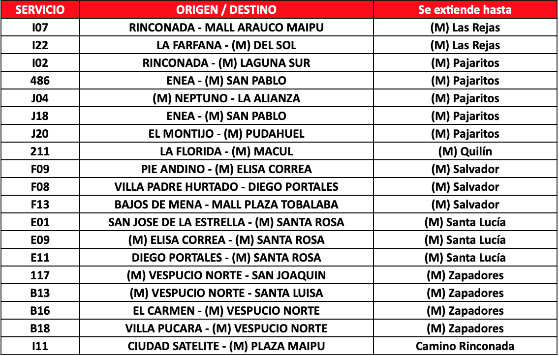 Para garantizar el correcto funcionamiento del sistema, se mantienen los refuerzos de apoyo y extensiones de servicio hacia las estaciones de Metro que aún permanecen cerradas, esto principalmente en las comunas de Puente Alto, La Florida, La Cisterna y Maipú.