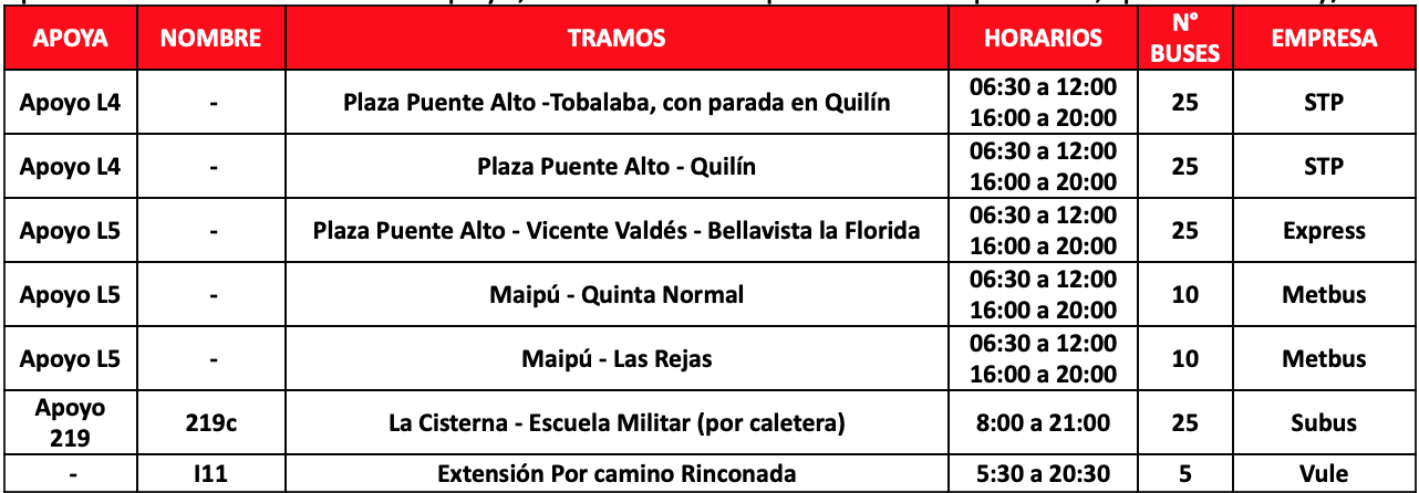 Respecto a los buses de apoyo, habrá 125 buses adicionales para reforzar la operación. Serán en total 7 serviciosque permitirán a los usuarios de las comunas de Puente Alto, La Florida, La Cisterna y Maipú tener mayores alternativas para llegar a las estaciones de Metro que están operando.