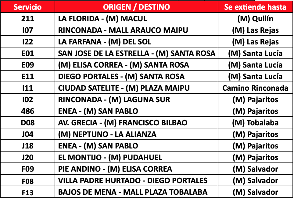 Para garantizar el correcto funcionamiento del sistema, se mantienen los refuerzos de apoyo y extensiones de servicio hacia las estaciones de Metro que aún permanecen cerradas, esto principalmente en las comunas de Puente Alto, La Florida, La Cisterna y Maipú.