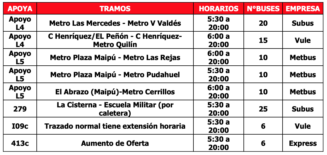 Respecto a los buses de apoyo, se mantienen los 102 buses adicionales para reforzar la operación que se distribuirán en 8 servicios que permitirán a los usuarios de las comunas de Puente Alto, tener una alternativa de transporte en los tramos en que no está funcionado Metro. En caso de requerir más apoyos por aumento de aglomeraciones se activarán más servicios de buses.
