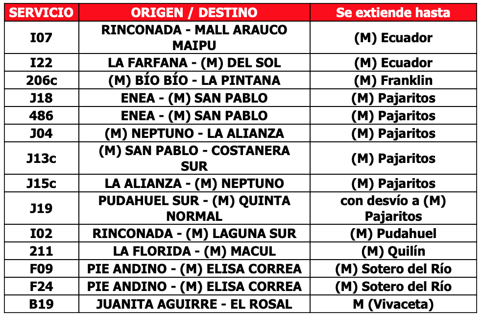 Para este jueves 28 de noviembre se contará con 102 buses de apoyo a Metro, distribuidos en ocho servicios y 14 extensiones de recorridos, para facilitar el traslado de los usuarios, principalmente en las comunas de Puente Alto, La Florida, La Cisterna y Maipú.