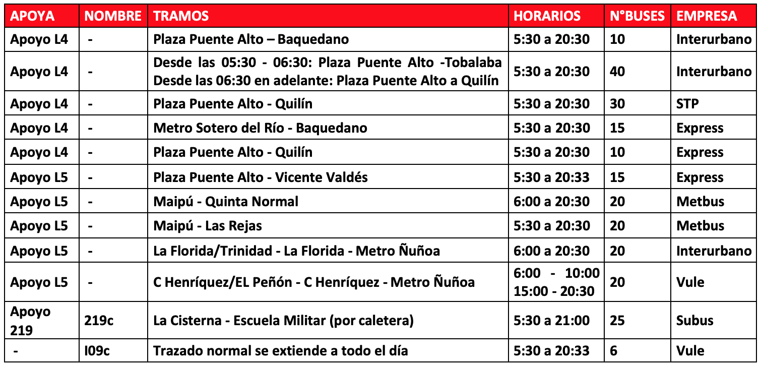 Para garantizar el correcto funcionamiento del sistema, se mantienen los refuerzos de apoyo y extensiones de servicio hacia las estaciones de Metro que aún permanecen cerradas, esto principalmente en las comunas de Puente Alto, La Florida, La Cisterna y Maipú.
