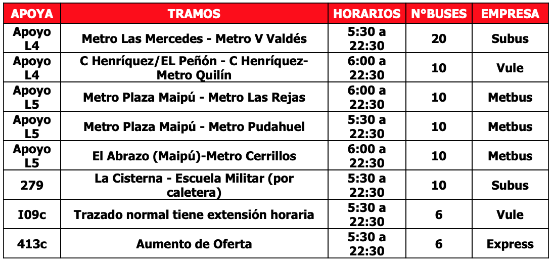 Respecto a los buses de apoyo, se contará con 82 buses adicionales para reforzar la operación que se distribuirán en ocho servicios que permitirán a los usuarios de las comunas de Puente Alto, Maipú, Pudahuel, La Cisterna y La Florida, tener una alternativa de transporte en los tramos en que no está funcionado Metro. En caso de requerir más apoyos por aumento de aglomeraciones se activarán más servicios de buses.