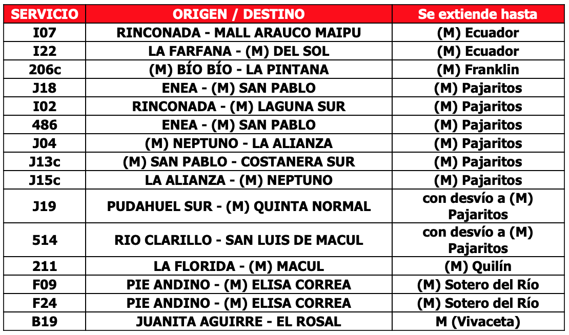 Al igual que en días anteriores, y gracias al compromiso de los dirigentes gremiales y responsables de líneas de taxis colectivos, los servicios se mantendrán de forma habitual, con extensiones hasta el centro de Santiago y hasta estaciones de Metro que se encuentren habilitadas. Esto principalmente en las comunas de Maipú y Puente Alto.
