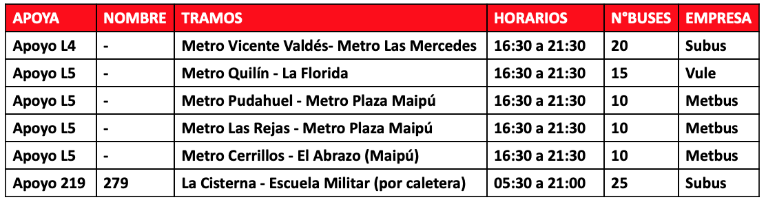 Hay que considerar que estos servicios de apoyo funcionan en forma adicional a los servicios habituales que también ofrecen cobertura a este sector. Se precisa que estos servicios de apoyo serán realizados por buses del sistema, lo que permite además suspender la operación de buses interurbanos.